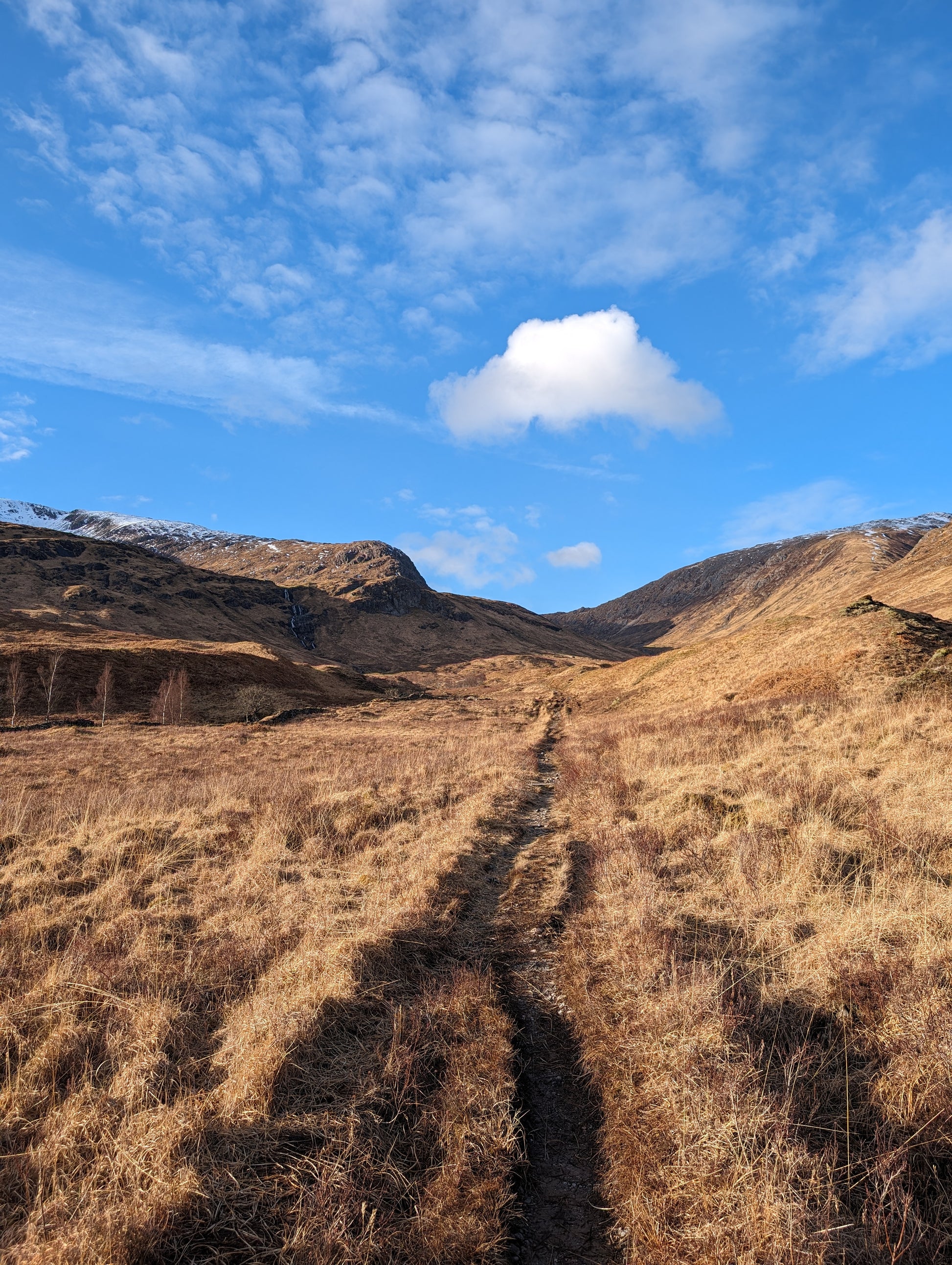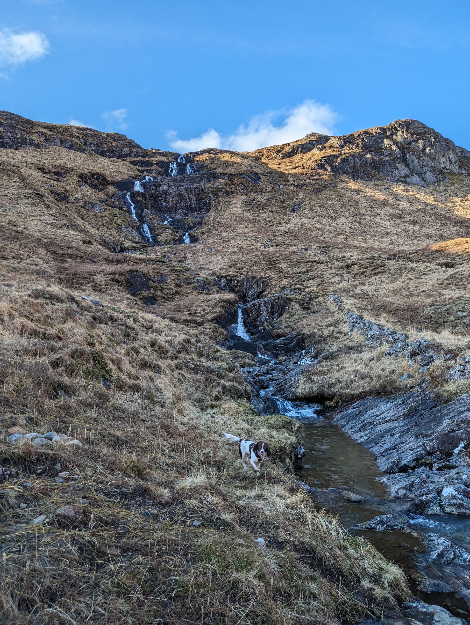 I discovered this spot while climbing a Munro on an unusually sunny March morning. Taking a slightly lesser known path I came across this collection of waterfalls and noted them for a return trip in the summer months. Since then this has become one of my favourite, more remote, swimming spots. I have only ever met a few people on this trail and they mostly are focused on getting up or down the overbearing Munro.