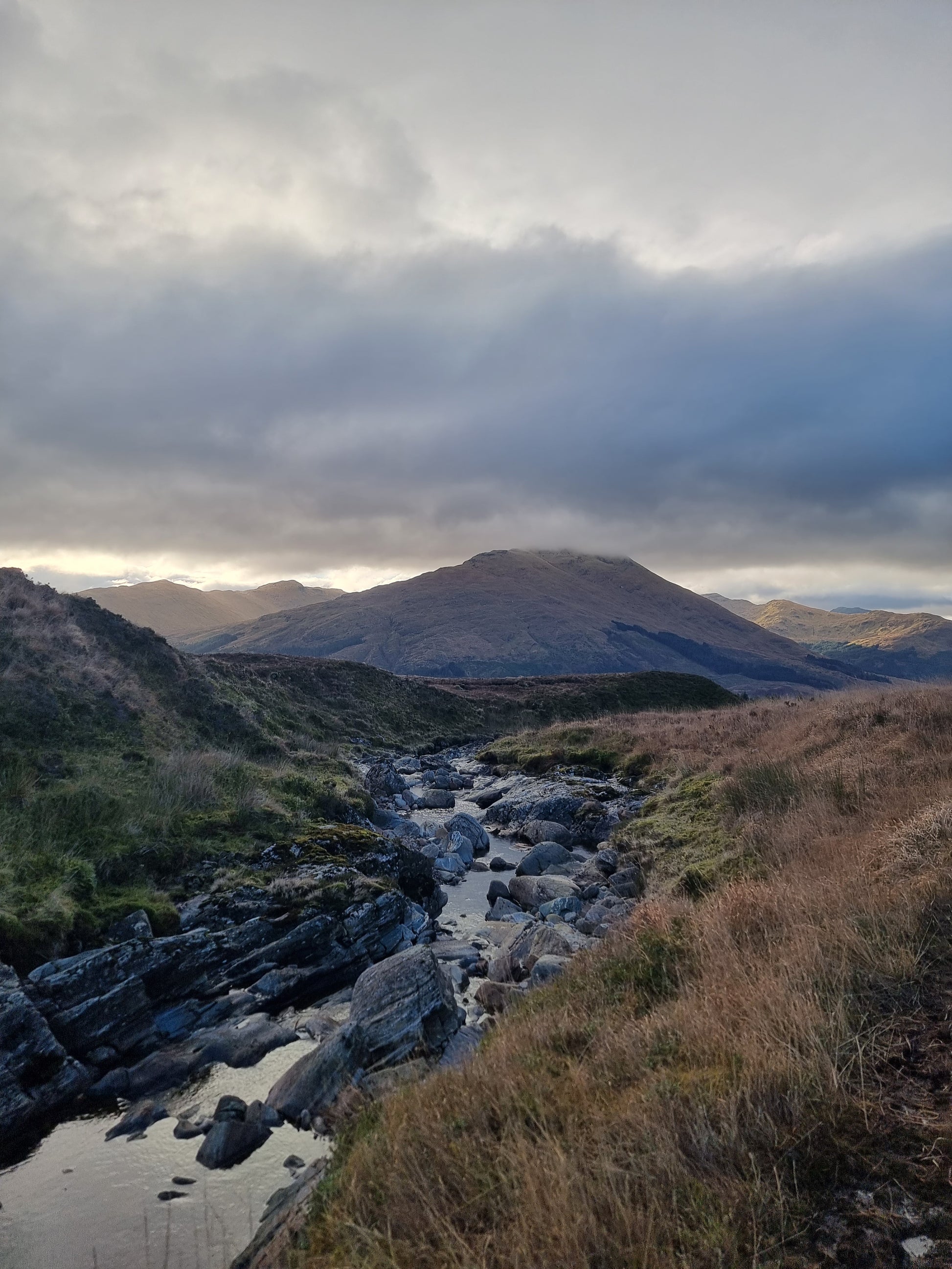 A well marked but boggy path leads you on a steep ascent that eventually skirts along the side of a large burn dotted with stunning pools of fresh highland water. Quiet almost all year round, the summer weekend often attracts a few hikers that tend to fill the nearer parking.